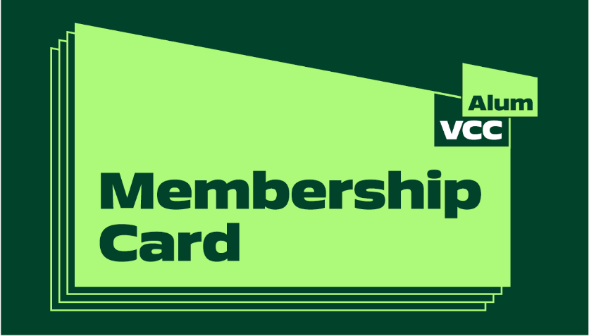 Your VCC Alum Membership Card is free for all VCC Alum, and entitles you to on-campus benefits such as access to the VCC Library, a 10% discount on VCC insignia items available for purchase at the VCC Bookstore; 10% off when you visit our salon and spa; and discounts on certain special events and services.